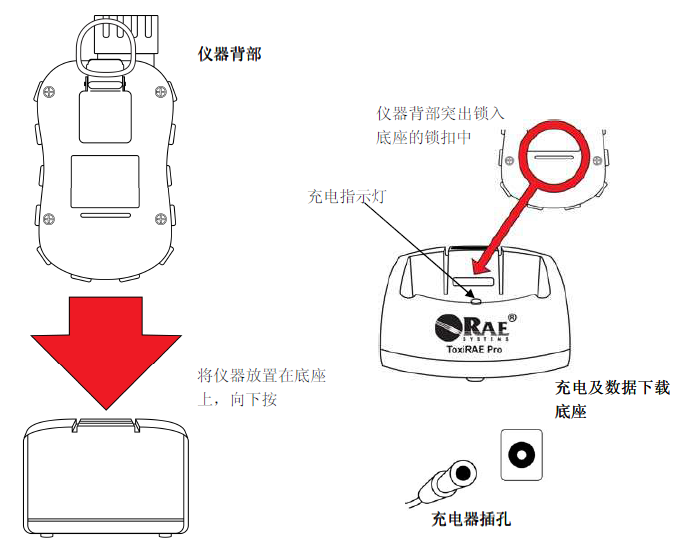 充電結(jié)束后,將充電底座后部的鎖扣向下按,即可松開鎖定、取下儀器。