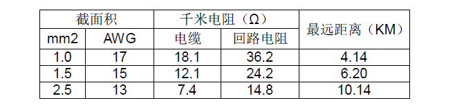 根據(jù)使用屏蔽線纜的技術參數(shù)可確定檢測儀的最遠傳輸距離,見下表: